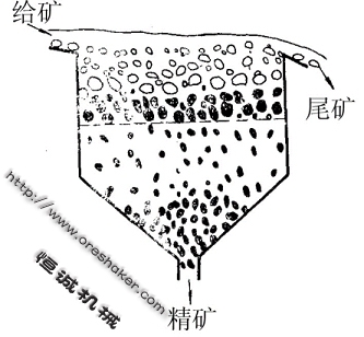 (1)透篩排料法此法是將重礦物透過篩孔排入底箱.如圖2所示。在排料粒度較細而篩孔尺寸又不能過分小的情況下使用。為了控制排料速度,需在篩面上鋪置另外一層料石。它們由密度接近或略大于重礦物的礦塊組成,有時也采用金屬球,粒度為篩孔尺寸的1.2~ 2倍,稱作人工床層。人工床層也隨水流的升降而作起伏運動,重礦物穿過床石的曲折通道下落,尤如通過排礦閘門一樣。改變床石的粒度、密度或鋪置厚度,即可調節重產品排出的數量和質量。排入底箱的重產品根據數量多少,可以連續地或間斷地通過閥門放出。