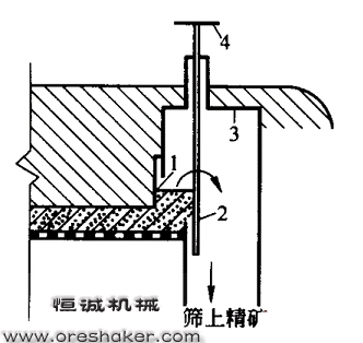(2)中心管排料法此法主要用于小型跳汰機,可排放粗粒精礦,過程如圖3所示。在跳汰室中心線靠近尾礦端設置排料管。排料管的上口高出篩面一定距離,外面裝有套管。套管底緣距篩面有一定高度并可調節。聚集在管外的重礦物借助床層壓力進入套管內,然后轉入中心管排到機箱外面。調節套管下緣距篩面高度,即可改變重產品的排放數量和質量。這種方法只適用于精礦產率不大的情況。