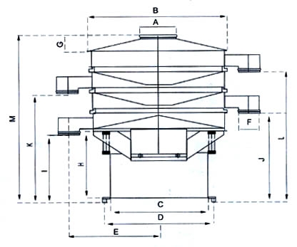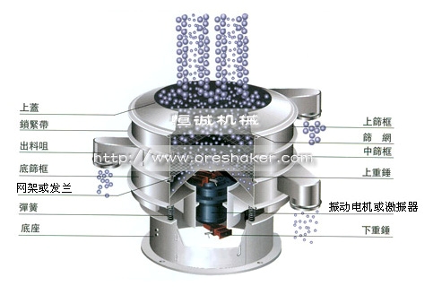 LT系列旋振篩,由直立式電機(jī)作激振源,電機(jī)上、下兩端安裝有偏心重錘,將電機(jī)的旋轉(zhuǎn)運(yùn)動(dòng)轉(zhuǎn)變?yōu)樗健⒋怪薄A斜的三次元運(yùn)動(dòng),再把這個(gè)運(yùn)動(dòng)傳遞給篩面。調(diào)節(jié)上、下兩端的相位角,可以改變物料在篩面上的運(yùn)動(dòng)軌跡。