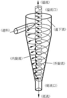 水力旋流器的構造:上部為圓錐形。在圓柱形筒體上裝有與筒壁呈切線方向的給礦管。圓錐上部裝有與圓柱部分相連通的中心溢流管。溢流管的上端則通過緩沖室或直接與外部管道聯(lián)接以排出溢流。在圓錐形底部裝有沉砂咀,以排出粗粒沉砂。為了減不磨損,可在給礦口、沉砂咀及筒體內壁襯以耐磨橡膠或用輝綠巖、鑄石、碳化硅等耐磨材料。