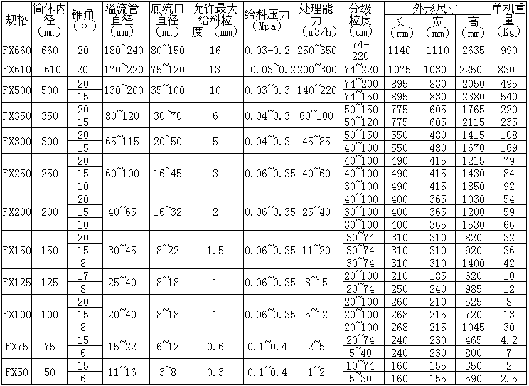 根據磨礦處理量、溢流細度和沉砂濃度的要求,正確選擇合適規(guī)格及型號的旋流器,是能否達到最優(yōu)化工作條件的前提。可為用戶提供Φ50、Φ75、Φ100、Φ125、Φ150、Φ200、Φ250、Φ300、Φ350、Φ500、Φ660等單機、并聯(lián)機組或串聯(lián)機組。