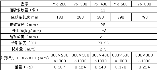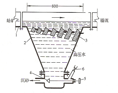 水力分級箱是一鐵制的角錐箱,上部安有楔形阻砂條,下面裝有分級箱底閥。通常由從200毫米到800毫米一系列寬度的分級箱用普通水槽聯結而成,沉砂則由粗到細排出。