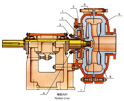 1. 泵體 2. 減壓蓋 3. 填料壓蓋 4. 軸套 5. 副葉輪 6 .后護套 7. 葉輪 8. 前護套 9. 泵蓋 |