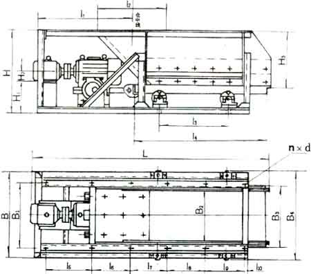 槽式給料機可以架設于地面,也可以吊裝在礦倉卸料口上。槽底板作往復運動,其沖次為20-60次/min,沖程為20-200mm。沖程可由驅動裝置偏心輪進行適當調整,偏心距為沖程之半。據一些選礦廠生產實踐,對于粘性礦石,偏心距不應小于30mm。槽式給料機的槽體寬度約為給料最大粒度的2-2.5倍。最大的槽式給料機,可滿足小于500mm粒度鐵礦石的給礦 。最常選用的規格是980*1240槽式給料機,其給粒度為350-0mm,適于作為400*600鄂式破碎機的給料設備。產品結構及材質: