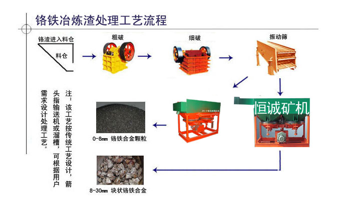 鉻鐵渣多數呈塊狀,硬度較大,因此需要將塊狀鉻鐵渣破碎到一定的粒度,使大部分鉻鐵合金顆粒與廢渣基本分離,再采用選礦的方法分選出鉻鐵合金。鉻鐵合金顆粒有較大的比重,而廢渣的比重較小,兩者比重差大,采用重選的方法和設備可以獲得較好的選礦指標和經濟指標。由于鉻鐵合金塊越大價格越高,因此不少客戶要求盡可能早回收大塊鉻鐵合金。恒誠選礦設備廠根據此情況設計了0-30mm鉻鐵合金回收工藝流程。該工藝流程圖如下: