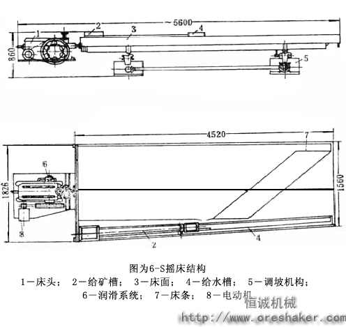本搖床主要由床頭、電動機、調坡器、床面、礦槽、水槽、來復條以及潤滑系統等八個部分組成。